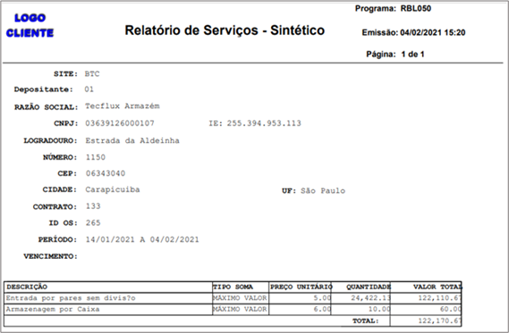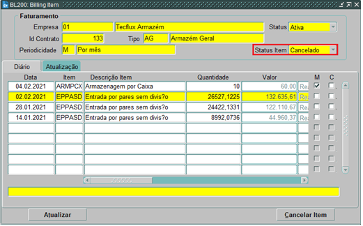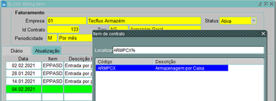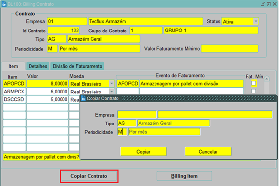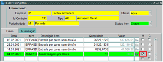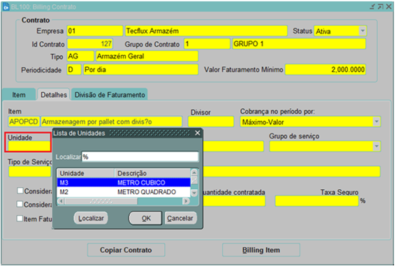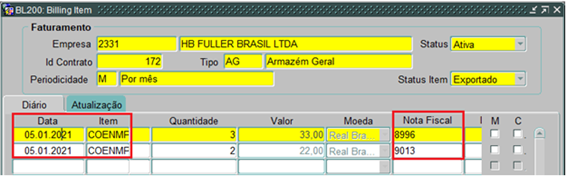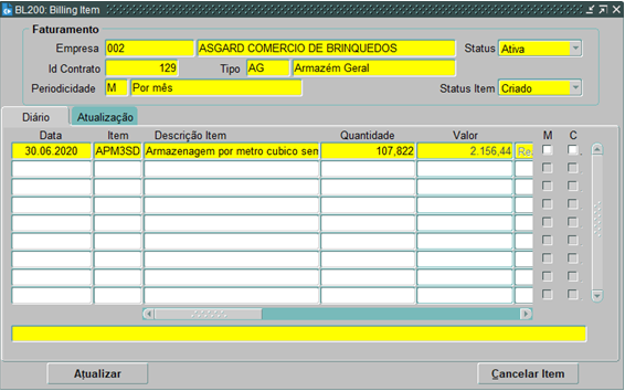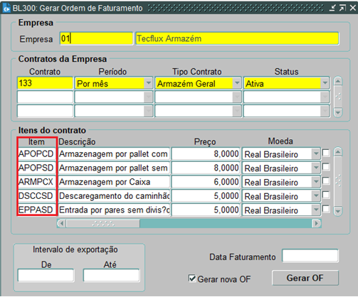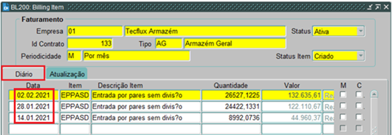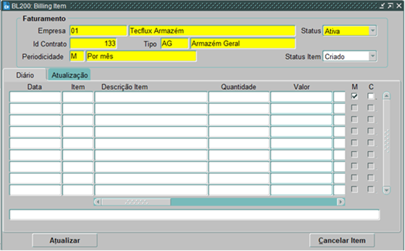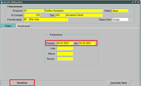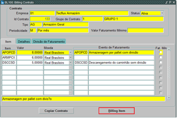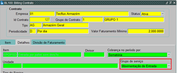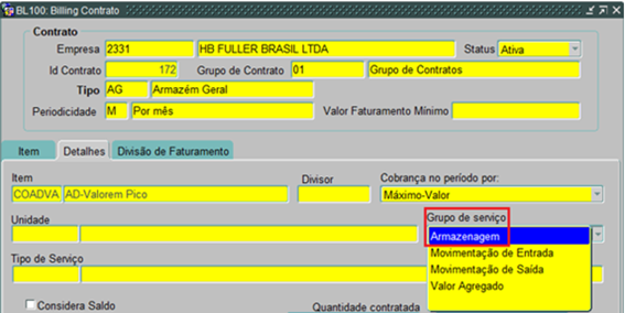 - Serviço: Preenchido para atualizar um item de faturamento específico. Exemplo: APOPSD - Armazenagem por pallet sem divisão.