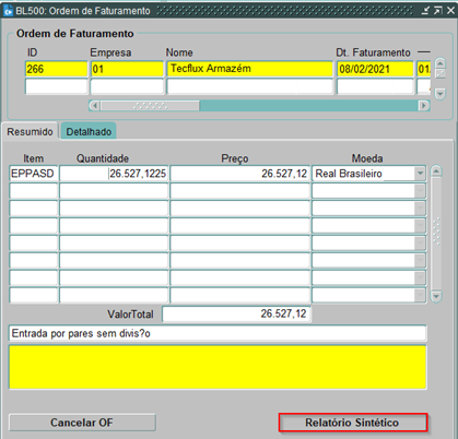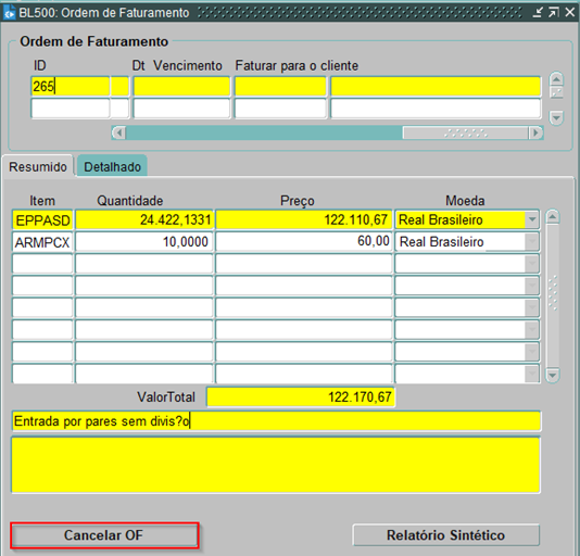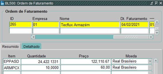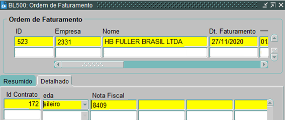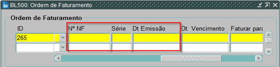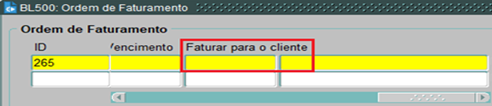 Consultar a OF na tela BL500: Ordem de Faturamento, basta inserir o ID gerado ao clicar no botão “Gerar OF”.