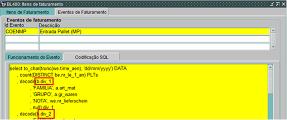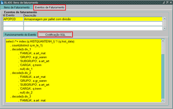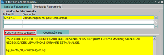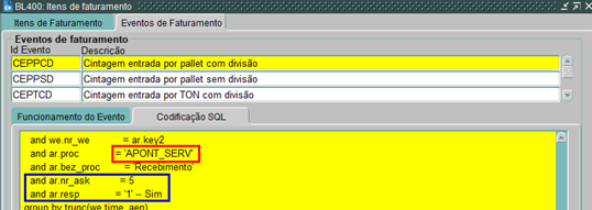 Acessando a Codificação SQL na BL400 na aba “Eventos de Faturamento” temos no processo apontado para “APONT_SERV” e logo abaixo temos a questão de faturamento referente ao evento.