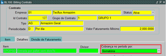 Pegando o gancho do evento acima, por ele fazer a cobrança em cima de cada pallet que foi recebido, o campo “Cobrança no período por” deverá ser preenchido com o valor “Somatória”: