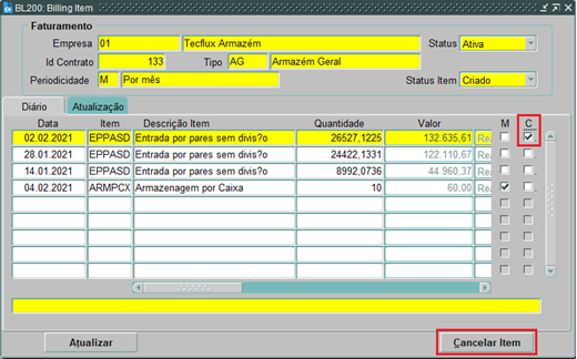Para o Cancelamento de linha deve-se marcar o flag no campo “C” (cancelamento) correspondente a linha que será cancelada e acionar o botão “Cancelar Item”:
