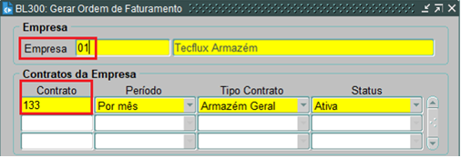 A ordem de faturamento é gerada na BL300: Gerar Ordem de Faturamento. Deve-se consultar a Empresa e o Contrato: