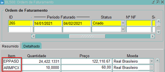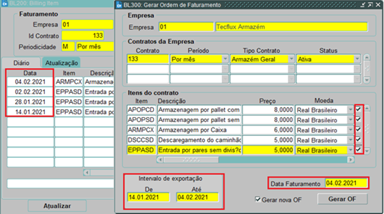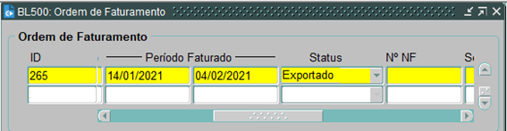 O campo “Dt Faturamento” é a informação que foi inserida no campo “Data Faturamento” na tela BL300: Gerar Ordem de Faturamento. O campo “Período Faturado” é a informação que foi inserida no campo “Intervalo de exportação” na tela BL300.