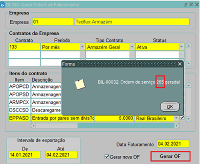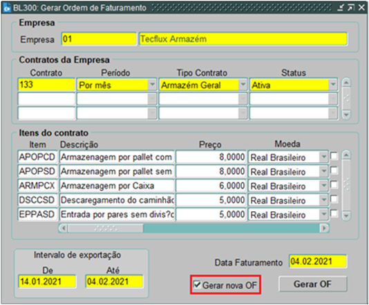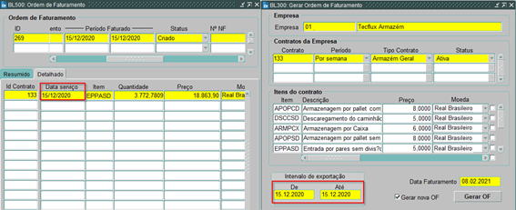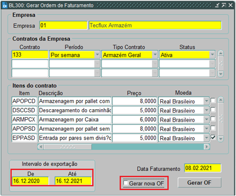 Porém o serviço que foi executado no dia 16/12 não foi contemplado na OF 269. Foi realizado novamente o processo na tela BL300, porém foi alterado o período de exportação e desmarcado o flag “Gerar nova OF”, exatamente com a intenção de que esse novo período fosse incluso na OF 269.