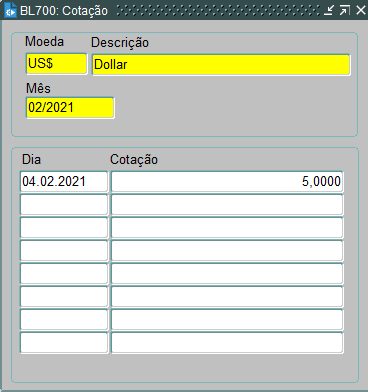 A tela BL700 é utilizada para cadastrar a cotação das moedas, por exemplo, o Dólar. Muito utilizada no WMS Aduaneiro.