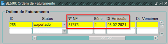 Após a OF ter sido gerada através da tela BL300, o status das linhas na tela BL200 é alterado para “Exportado”, pois uma vez que a linha é contemplada numa OF, ela não pode mais ser atualizada em um nova Ordem de Faturamento. Somente as linhas que entraram na OF que foi gerada terão o seu status alterado.