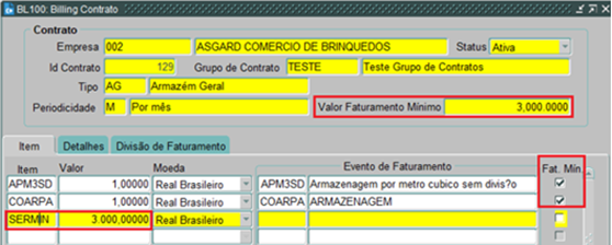 Os eventos que poderão ter faturamento mínimo, deverão ter o flag “Fat. Min.” marcado e no cabeçalho do contrato deve constar o valor para faturamento mínimo.