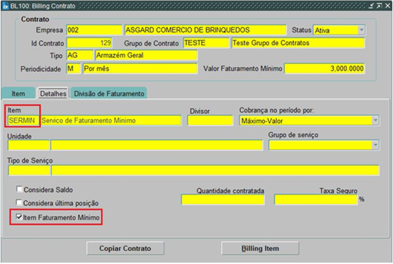 Na aba “Detalhes”, o item de faturamento mínimo deve ter o flag “Item Faturamento Mínimo” marcado: