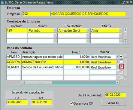 Gerar a OF na tela BL300, conforme já exemplificado neste documento, porém o item de faturamento mínimo também deverá ser selecionado: