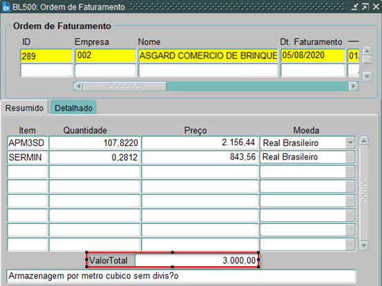 Na tela BL500 é gerada uma linha do item de faturamento mínimo com a diferença de valor, caso o total da OF não tenha alcançado o valor mínimo cadastrado no contrato do cliente: