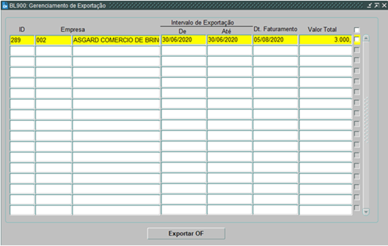 Depois de realizar a análise da OF que foi criada, é necessário realizar a exportação através da tela BL900: Gerenciamento de Exportação, marcando com um flag a OF que será exportada e clicar no botão “Exportação OF”.
