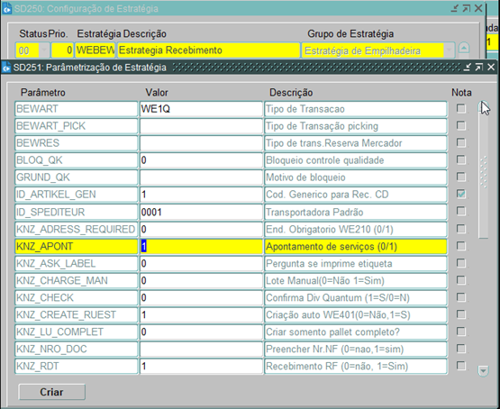Para que as questões sejam exibidas no coletor é necessário acessar a estratégia WEBEW: KNZ_APONT, onde 0 desabilita e 1 habilita o apontamento de serviços.