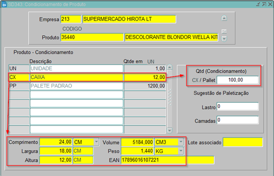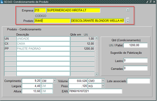Para acessar o cadastro dos produtos com suas cubagens, devemos ir ao menu Conceitos Principais/Cadastro/SD343: Condicionamento de Produto.