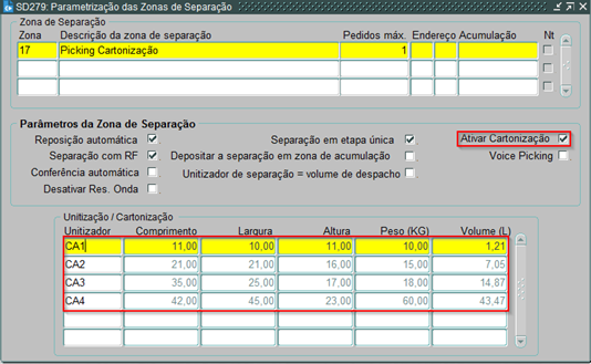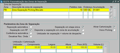 Devemos selecionar a zona de separação e marcar um flag nos parâmetros necessários. É importante marcar o campo “Ativar Cartonização”, para que o processo da quebra de lote da cartonização seja executado.