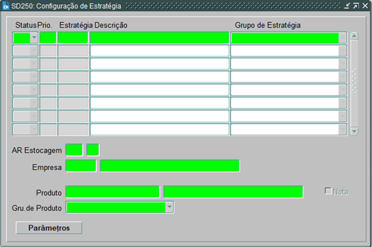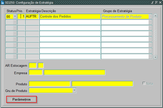 Ao acessar o menu, será exibida a tela SD250: Configurações de Estratégia, onde devemos pesquisar “AUFTR” no campo estratégia, para inserir as respectivas configurações.