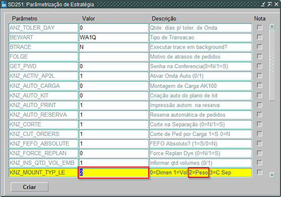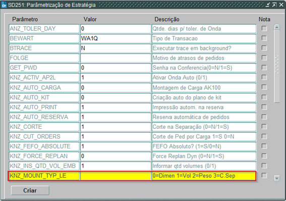 Será exibida a tela SD251: Parâmetrização de Estratégia, nessa tela temos o parâmetro “KNZ_MOUNT_TYP_LE”, onde é possível ativar uma das 4 opções de lógica de parametrizações, conforme segue: