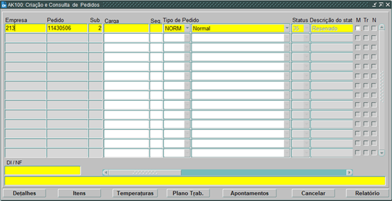 Atualizando a consulta pelo nº do pedido na AK100: Criação e Consulta de Pedidos, podemos verificar que o status do pedido foi atualizado para 35-Reservado.