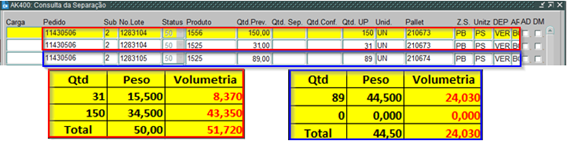 Consultando o pedido na tela AK400: Consulta da Separação, onde é possível identificar a quebra dos Lotes de Separação efetuada no ato da reserva, conforme parametrização do processo de Cartonização.