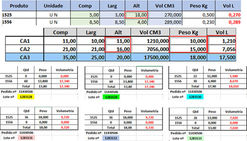 Podemos analisar, na planilha a seguir, como o sistema calculou e condicionou da melhor forma possível a acomodação dos produtos, otimizando caixas e respeitando todas as regras de separação.