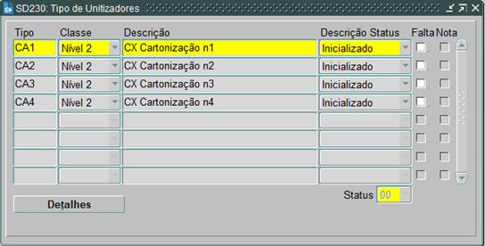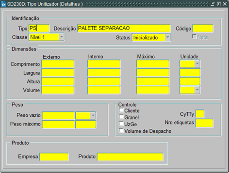 As informações do grid “Unitização/Cartonização” são referenciadas da tela SD230: Tipo de Unitizadores.