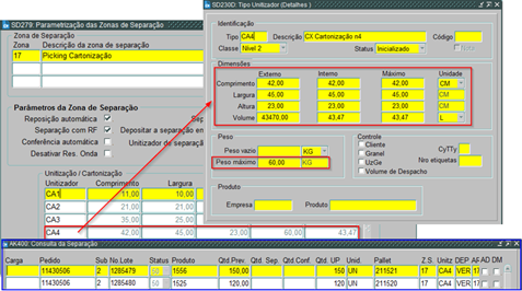 Ao consultar a tela SD279 é possível verificar a capacidade máxima de Peso e Volumetria de cada embalagem (cadastradas na SD230: Tipo de Unitizadores).