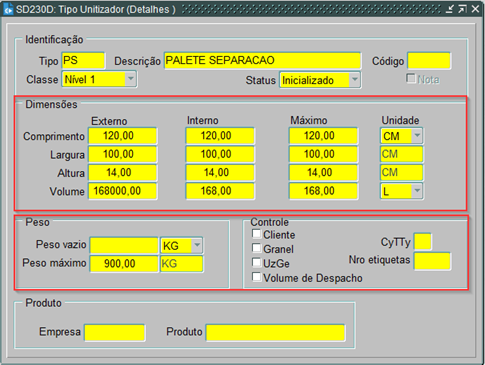 Na SD230D: Tipo Unitizador (Detalhes), com extrema atenção, devemos preencher as Dimensões e Peso do unitizador e, após realizar o processo, devemos novamente salvar.