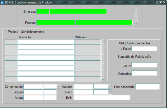 Ao acessar o menu, será exibida a tela SD343: Condicionamento de Produto, em verde, pronta para começar o cadastro do condicionamento do produto.