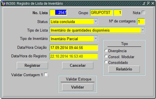 No bloco “Linhas”, há um campo chamado “Lista Número”, que é gerado automaticamente pelo sistema no momento da criação do plano de inventário na tela IN100 (tela comentada anteriormente). A princípio, o número da lista já deve estar configurado como “1”. No momento da validação, caso exista divergência na contagem de estoque, o sistema cria uma nova lista (“0”), que será utilizada para realizar a recontagem e revalidação do estoque.