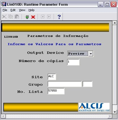 Existe a possibilidade de reimprimir o relatório do plano, consultando-o na tela, inserindo o número do plano no campo “Lista”, e em seguida clicando em “Reimprimir”. A primeira impressão do relatório será automática no momento da criação do plano. O relatório criado é o LIN010A, com todas as linhas do plano.