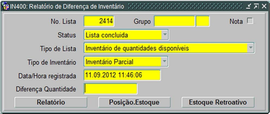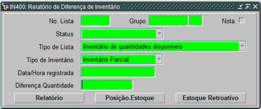 A tela pode ser aberta pela tela principal “Informação”, tendo assim que digitar o número da tela e confirmar, ou pelo menu “Funções” → “Inventário” → “IN400: Relatório de Diferença de Inventário”.
