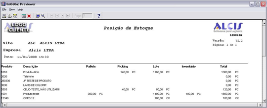 Ao clicar no botão “Posição. Estoque”, o sistema abrirá a seguinte tela, que executa um relatório de posição de estoque: