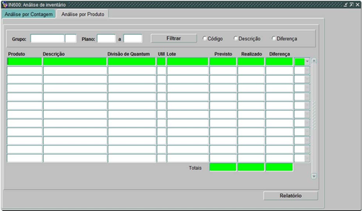 O botão “Relatório” executa um relatório de análise de inventário por produto.