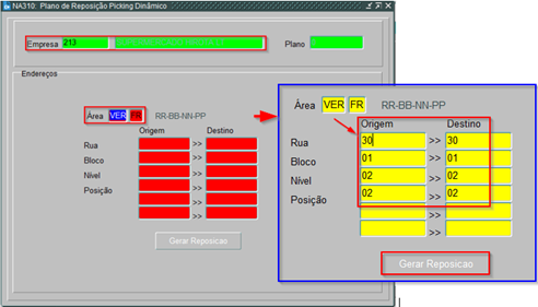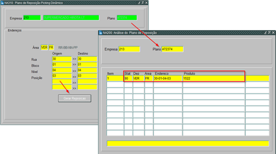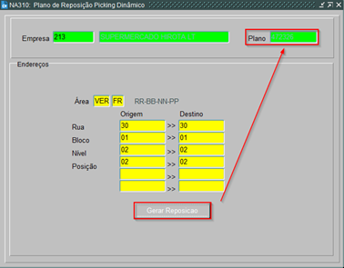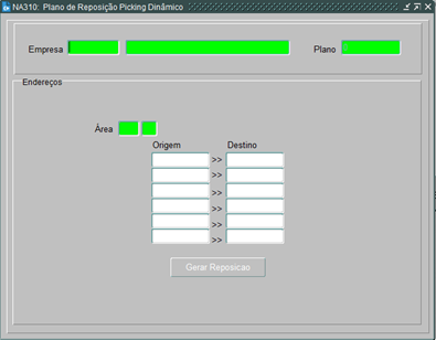 Para iniciar o preparo de uma reposição é necessário acessar a tela que informa os endereços a serem transferidos os produtos “NA310: Plano de Reposição Picking Dinâmico”, no menu Funções/Reposição de Picking/NA310: Plano de Reposição Picking Dinâmico.