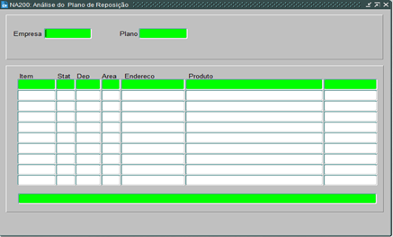 Para consultar a preparação do plano de reposição é necessário acessar a tela “NA200: Análise do Plano de Reposição”, no menu Funções/Reposição de Picking/NA200: Análise do Plano de Reposição.