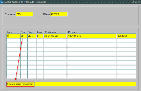- “Status” - informa o status em que se encontra a linha do plano. Se “90”, significa que a reposição foi realizada, se “80”, significa que houve algum problema no momento da geração da linha, ou seja, falta de estoque, endereço bloqueado, etc.