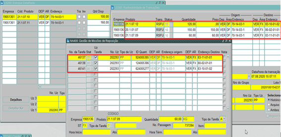Durante o processo de separação de picking, foi identificado que não tinha produto no endereço para ser separado. Então, na “NA400” podem ser visualizadas as missões criadas “Stat 00” disponíveis para o processo de ativação.