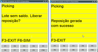 Nesse ponto é exibida a mensagem para Liberar Reposição. Para isso, o separador deve usar a função “F6” no coletor, que autoriza a liberação, e em seguida a tela do coletor será atualizada, indicando que a reposição foi gerada com sucesso.