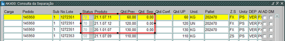 Ao atualizar a consulta na tela AK400 pode-se verificar que o status das linhas de separação foram atualizados para “70”, o que indica que houve um pulo no processo de separação.
