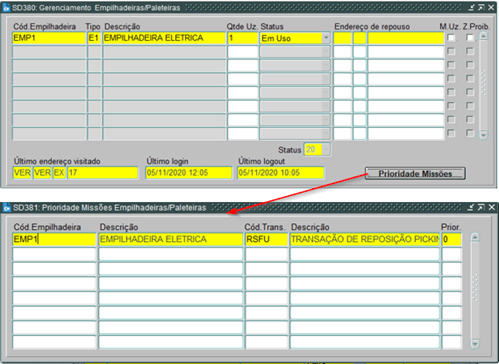 - Verificar o cadastro dos equipamentos nas telas SD380: Gerenciamento Empilhadeiras/Paleteiras e SD381: Prioridade Missões Empilhadeiras/Paleteiras.
