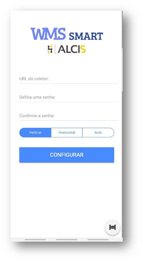 Esta tela tem a finalidade de vincular o coletor web ao seu dispositivo. É composta por URL do coletor, senha para administração e opção de posicionamento da câmera. Todos os campos devem ser preenchidos.