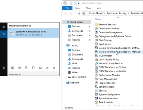 2 – Na barra de pesquisa do Windows, acessando o Windows Administrative Tools e depois o Internet Information Services (IIS).