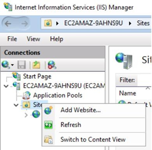 Depois de acessar o IIS Manager, crie um site clicando com o botão direito do mouse em “Sites” e depois em “Add Website”.