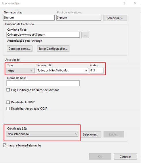 Caso escolha tipo como Https, será necessário a instalação de um certificado SSL. A configuração HTTPS é recomendada pela Alcis por questões de segurança. Com o HTTPS o tráfego de informações é criptografado.