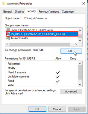 Ao ser exibido a janela de propriedades, localize “IIS_IUSRS” e clique em