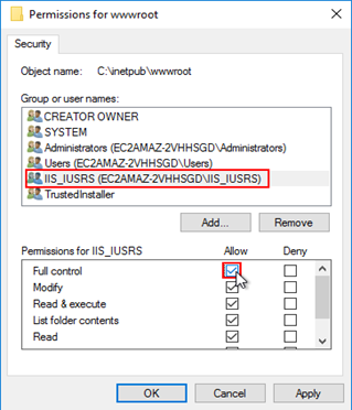 Será exibida a tela de permissões, localize novamente o usuário “IIS_IUSRS” vá até o campo “Full Control” e marque-o com um flag caso o mesmo não esteja marcado e clique em “Ok”.