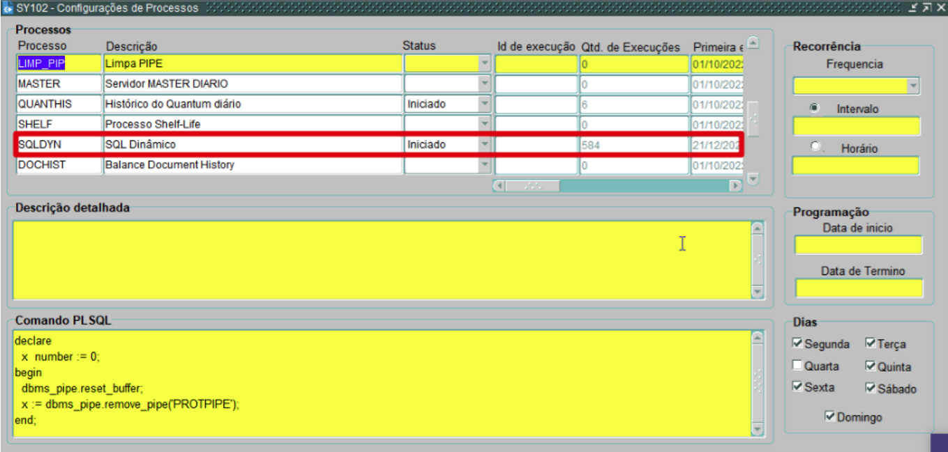 - Na tela SY102, verifique se o Status do Processo SQLDYN está como Iniciado.