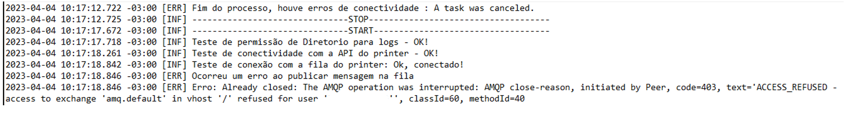 Caso a máquina em que o serviço está instalado não conseguir se comunicar com a fila, será exibida uma mensagem de Erro de Impressão ou Fim do processo, houve erros de conectividade.