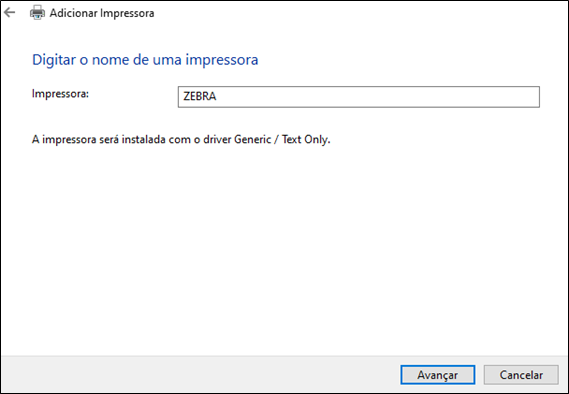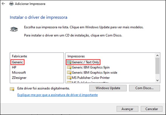 6. Selecione o driver Generic / Text Only e clique em Avançar.