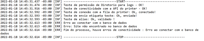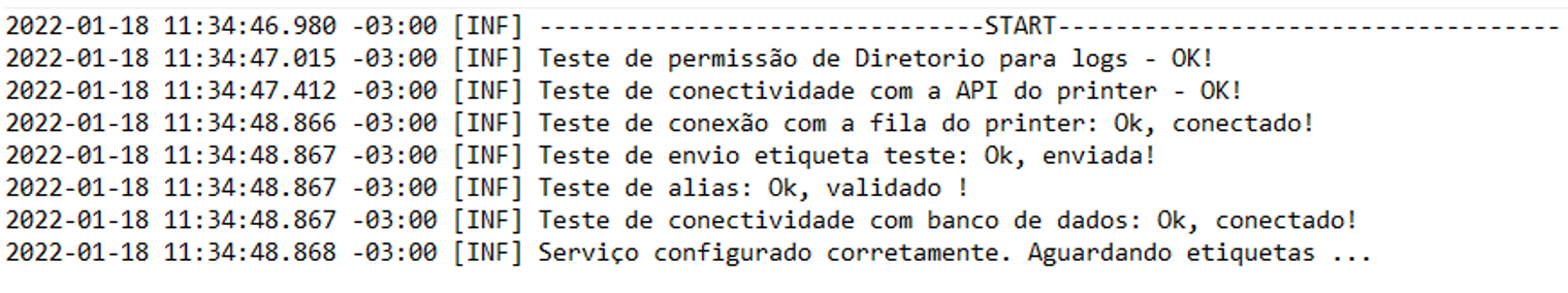 A mensagem Serviço configurado corretamente. Aguardando etiquetas . . . será exibida indicando que o serviço foi configurado e iniciado corretamente, e está pronto para realizar os procedimentos de impressão das etiquetas. Caso ocorra algum erro de configuração, o mesmo estará descrito neste mesmo arquivo de log.