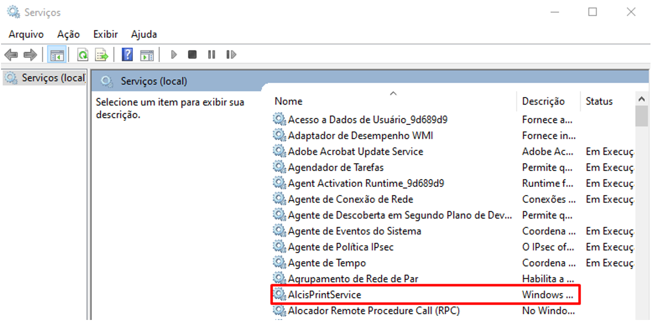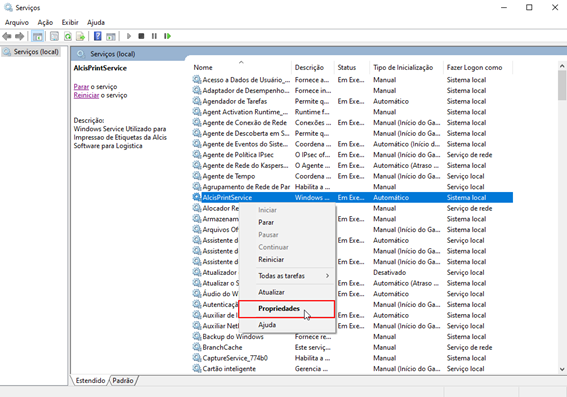 Pesquise pelos Serviços e em seguida clique com o botão direito sobre AlcisPrintService e vá até propriedades.